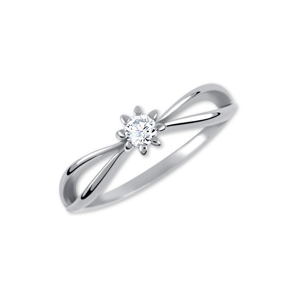 Zásnubní prsten z bílého zlata se zirkonem. Kámen je usazen v korunce. Prstýnek je zajímavý tím, že kroužek se směrem od kamene rozdvojuje a vytváří linii mašličky. Kroužek je pod kamenem trochuvyšší a proto se hodí knošení se snubním prstenem.