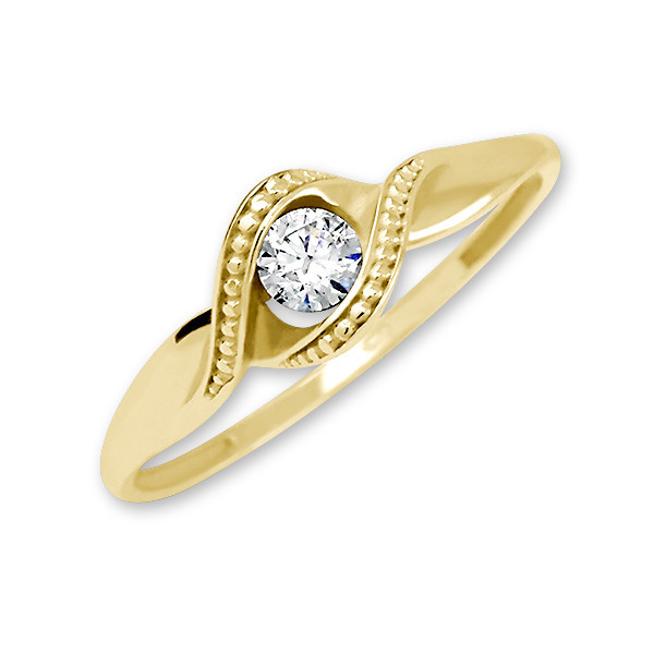 Zásnubní prsten se zirkonem, žluté zlato. Kámen o velikosti 3,5mm je orámován dvěma vlnovkami ze zlatých kuliček. Díky způsobu zasazení kamene, kdy kámen nevystupuje nahoru a hrany jsou oblé, se hodí ke každodennímu nošení. Najdete ho i v bílém zlatě.